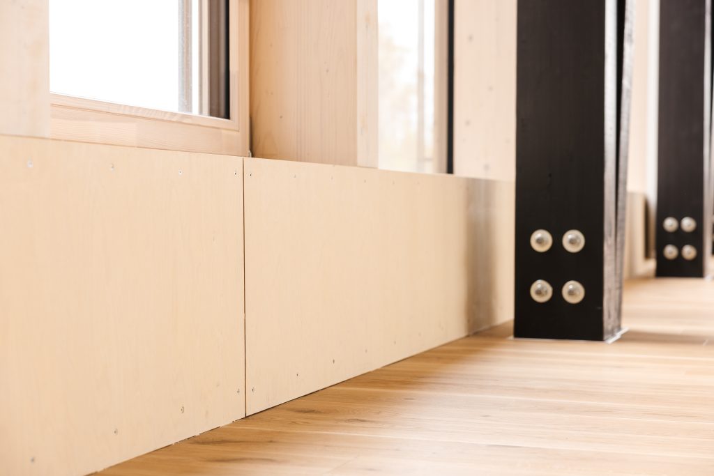 Moderns un kompakts interjers, kurā dominē gaišais bērza saplāksnis.