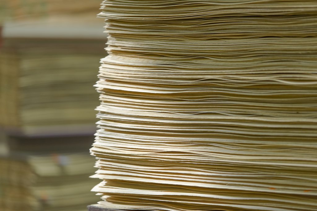 Sagatavotos finierus noklāj ar līmi un veido pilna formāta un konstrukcijas finiera paku.